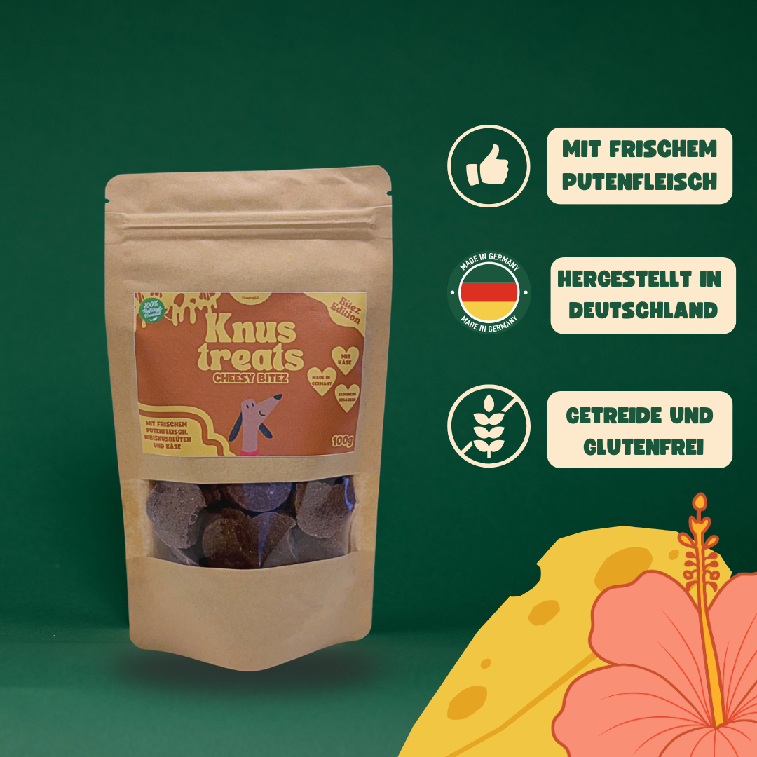 Kartoffelmehl, Reismehl, frisches Putenfleisch (18%), Kartoffelflocken, frische Putenleber (8%), frischer Käse (4%), Chiasamen (4%), Hibiskusblüten getrocknet (3%), Cellulose, Topinambur getrocknet (2%), Gemüsebrühe (1,5%), Bierhefe (1%), Geflügelfett (1%), Datteln getrocknet (1%), Hefe (0,5%), Carob (0,3%), Braunalge (0,2%).