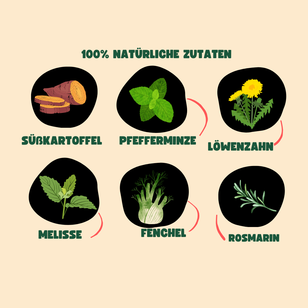 Zu 100% aufgeschlossene Süßkartoffel, Extrakte aus Ölsaaten, Hermetia Illucens Insektenprotein. Inulin, Pfefferminze, Anis, Pflanzenkohle, Löwenzahn, Melisse, Kamille, Fenchel, Hermetiafett, Bentonit-Montmorrilonit, Rosmarin.